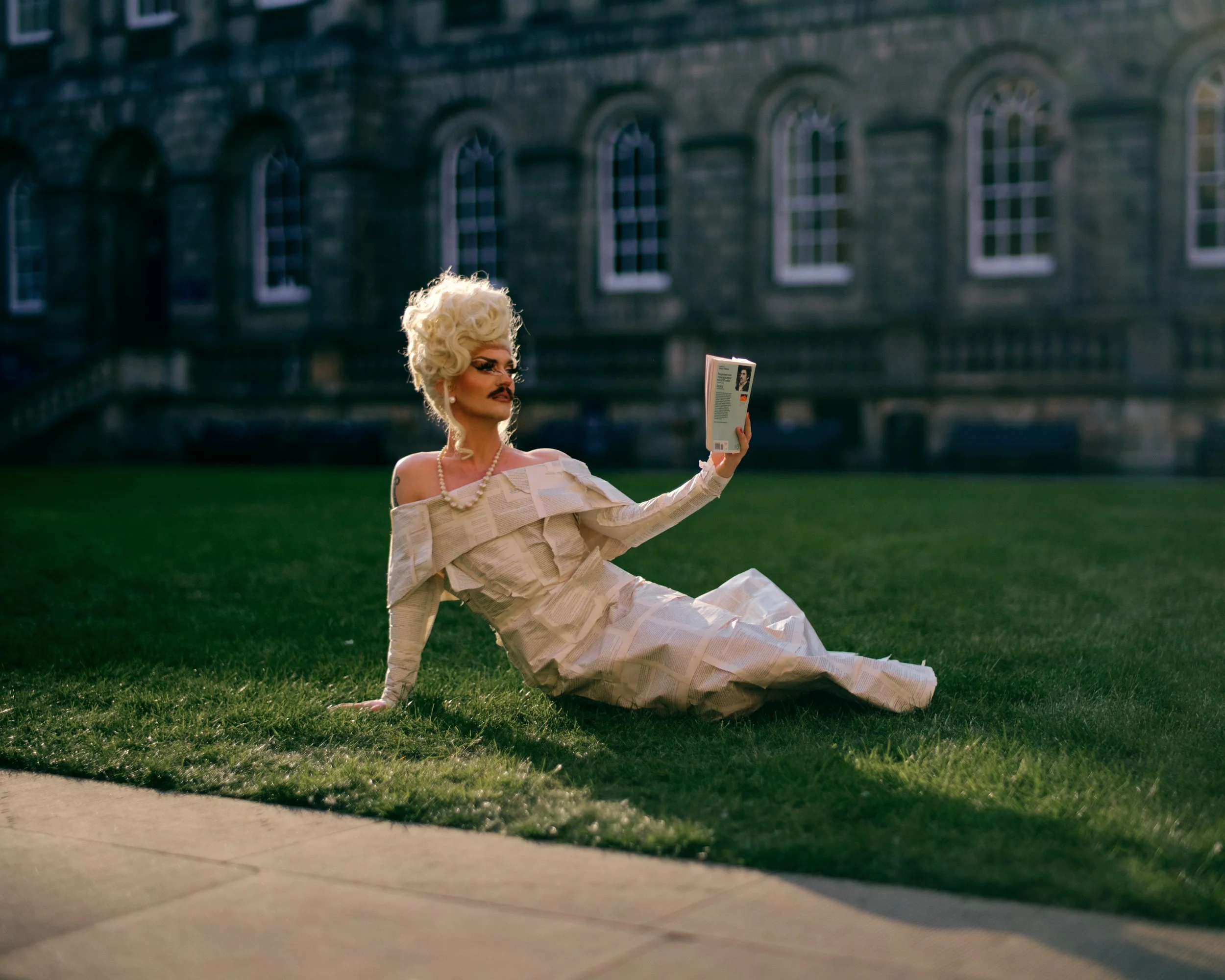 For the one year anniversary of my cabaret show, we wanted to make reference to the tradition of gifting paper, and created this paper gown using pages from queer classics such as Mrs Dalloway and The Picture of Dorian Gray. Shooting on the grounds of the University of Edinburgh’s Old College, we wanted to go for a grand sense of scale and history to coordinate with the literary theme. Thankfully the weather held up for us - always a bit of risk in Scotland.