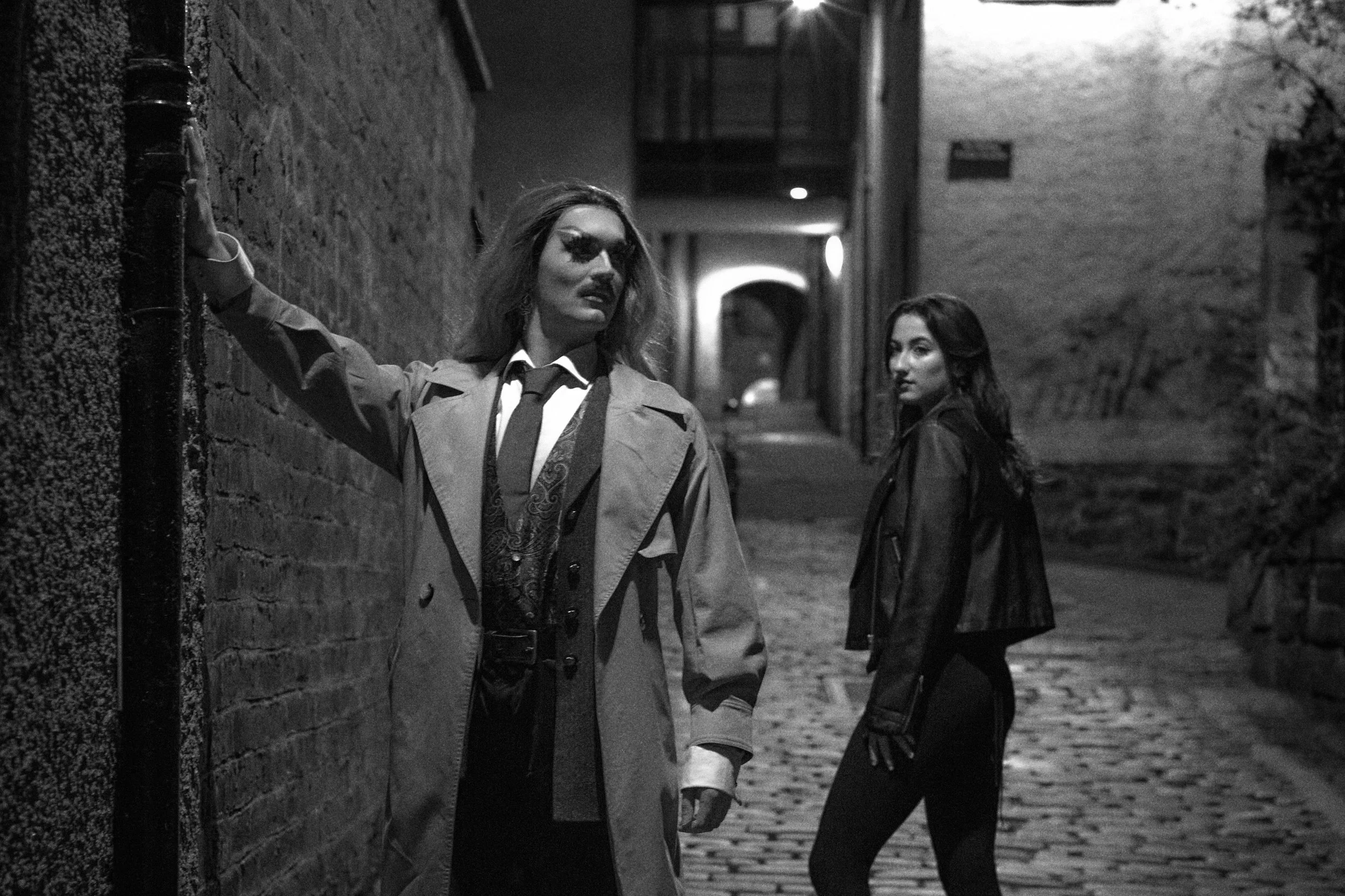 This show was inspired by murder mysteries, with all our performers having to come up with a story to tell through song that involved some kind of homicidal act. Our photoshoot was clearly very inspired by noir films and classic detective aesthetics, as well as more modern police dramas. We wanted to go for a combination of serious drama and camp humour, which tends to be a classic combination in my work across the board. We wanted it to stand out from our usual colourful palettes, so black and white worked wonders here to make this shoot stand out from the rest.